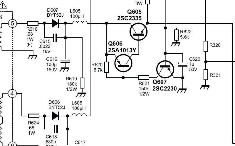 Hvala vam za sheme.Mnogo toga nije bas isto pa pokusavam da skontam nesto.Uglavnom mreza se sastoji od gretz-a BA10G(BR601); 4 tranzistora:C1815(Q601,Q603),B774(Q602),D1431(Q604),3 diode BYT52J(D603,604,605)...Sto se mreze tice jest slicna.Najgore mi je sto one pregorene komponente nemogu naci...