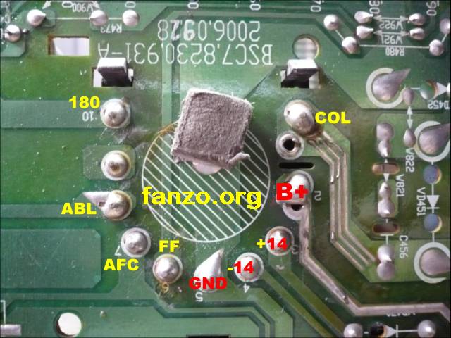 Uzmi bilo koji drugi trafo za 90stepeni, zalemi samo B+, kolektor i ABL i stavi kapu na ekran i probaj...