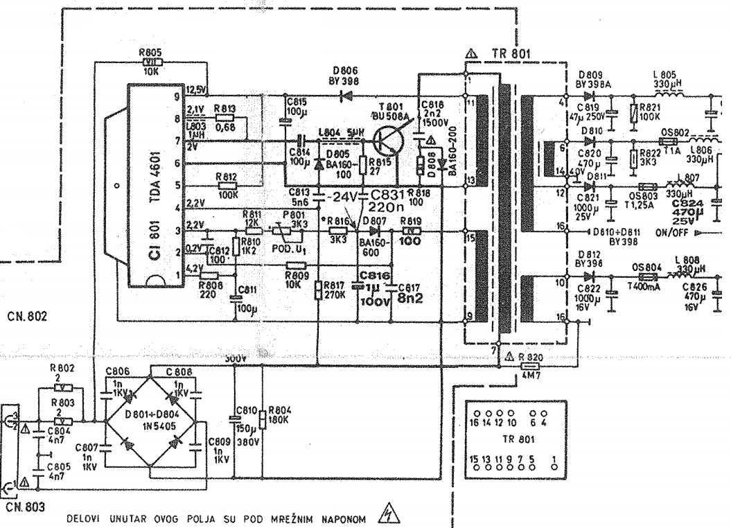 TV Izrovio sa tavana nakon 30ak godina, nije radio nikako, pogledam modul napajanja mreznog trafoa, jedan veliki otpornik (sada mjeri 12k), je skoro pa izgorio, tranzistor pregoren bio. Zamijenio njih, proradio samo zvuk, poceo opet isti otpornik da se pusi, i mrezni otpornik glavni, prije svega je izgubio kontinuitet. Zamijenio sa 470 ohma, sto je preveliko, ali je radio ton bez problema sa vrlo cistim zvukom, ali ako se pojaca preglasno ugasi se, pa se upali i tako. Ako oborim otpor na 235 ohma, otpornik se pocne pusiti odma. Ima li neko slucajno semu, mogu objaviti slike u prilogu sasije, ja nisam uspio nakon par mjeseci nigdje pronaci semu, sasija je dosta slicna Ei Nis B30 sasiji, ali ima razlika, izgledom skoro pa iste. Kada je otpor bio 235 ohma na mreznom modulu, tranzistor je izgorio, drugi komad.. Imam kompletnu sasiju od Ei Nis-a, isti je trafo, osim sto ima jedan dodatni pin ali mislim da moze se koristiti. Da li ima kratki spoj negdje, ne pokazuje vise od 600mA potrosnje kada se mjeri na mrezi. Uspio sam naparviti zvuk ali i tada se gasi ako je preglasan, molim vas ako bilo ko ima informaciju o semi ili uzroku, po potrebi cu poslati detaljne slike sasije i kucista. B+ je 256V, 250+ kako pise na sasiji, svi naponi izmjereni i djeluju dobro.