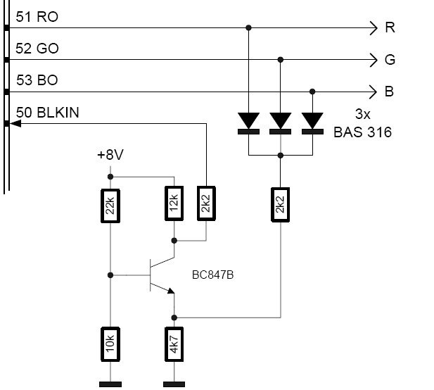 8V vežeš, normalno, na 8V tu blizu ima pored procesora, naći ćeš. I masu. A na RGB pločici samo presečeš žicu BL.