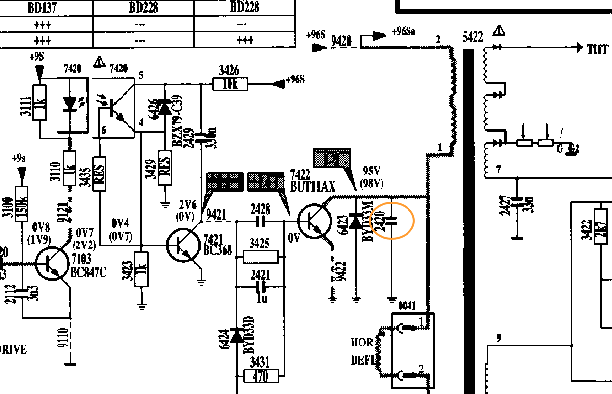 Odmah odspojite izlazni horizontalni tranzistor, da se ne bi opterećivala mreža bespotrebno jer u drastičnim uvjetima može reagirati na način da ne uspije srušiti horizontalni napon a onda “ćao” horizontalni izlazni transformator. U nekim verzijama ovog tipa kvara Hout tranzistor izdrži (kao u ovom slučaju) ali u nekima baš i ne, nego i on ode u kratki spoj. Ali on nije uzrok kod ovog tipa kvara, naime mreža reagira sa drastičnim rušenjem izlaznog napona i “cvilenjem” zbog neispravnog C2423 (na šemi je označen C2420) koji je pločasti blok kondenzator vrijednosti 102/1kV ili 1nF/kV, kako Vam je lakše. Ja uvijek stavim od dolje na stranu štampanh veza MKP blok iste vrijednosti. To su oni normalni četvrtasti u plastici. Od strane elemenata nema mjesta, nego samo za tanki okrugli. Svi vlasnici aparata koji su imali ovaj kvar su izjavili da su puno gledali taj tv, pa pretpostavljam da ne mogu izdržati zbog prevelike temperature. Možda i nisam u pravu. Bilo kako, novi blok kondenzator, nekada tranzistor i sve radi ok.