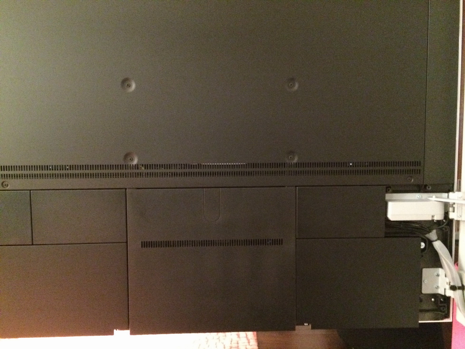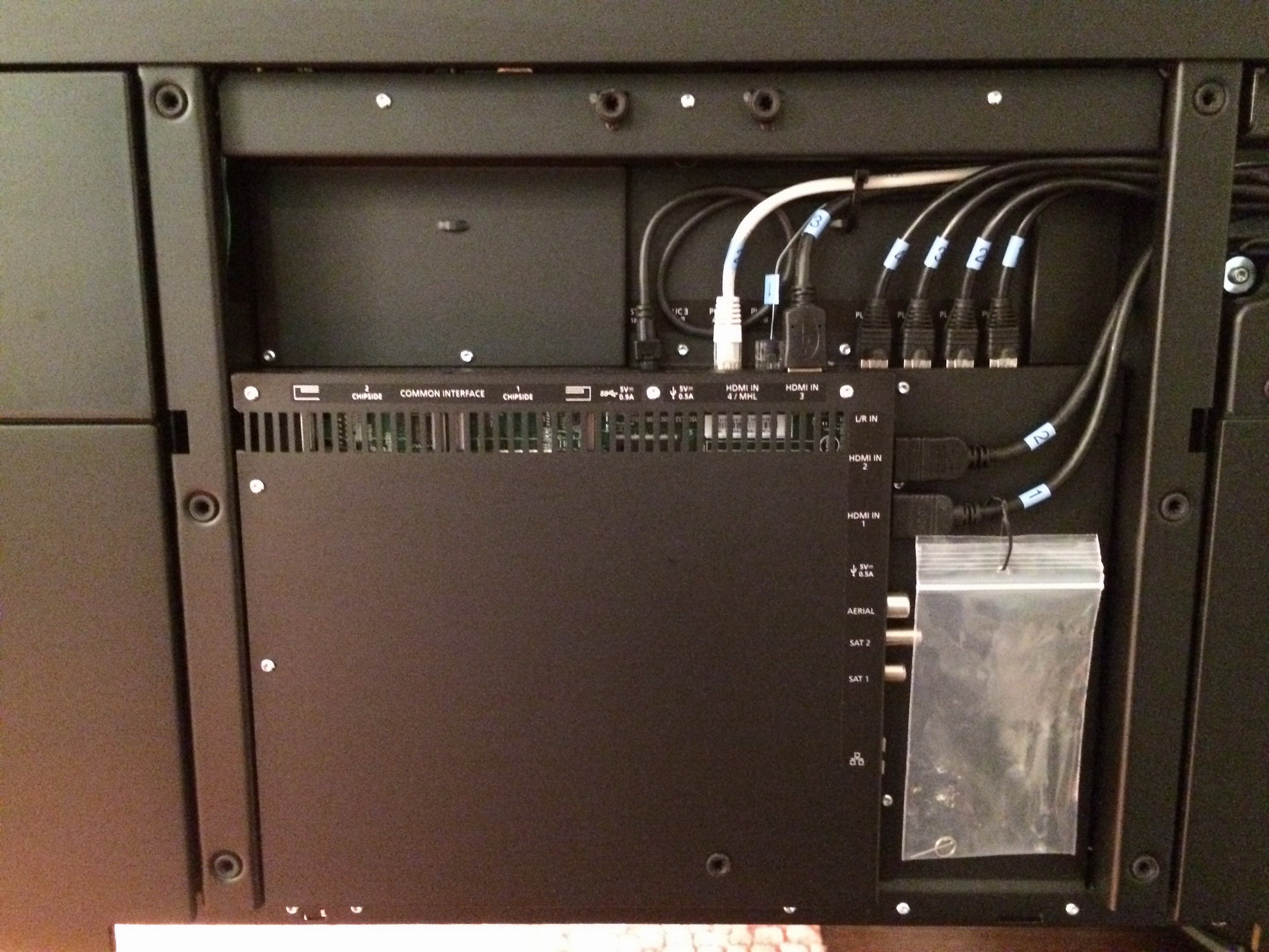 Uređaji poput SBB D3, produžni kablovi i ostalo su skriveni iza TV-a.