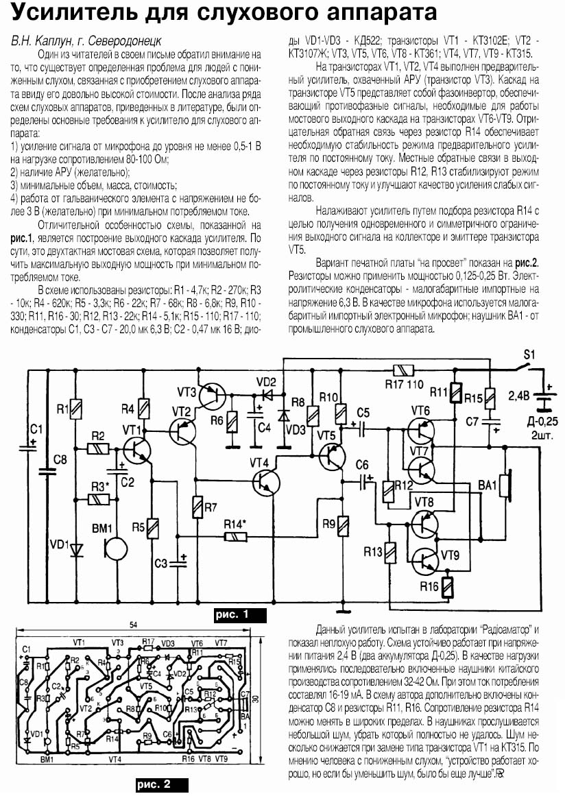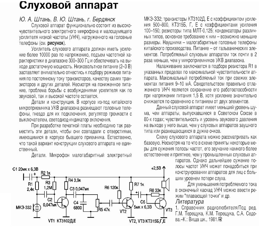Popravljao sam neke od aparata i većina njih je bila sa nekim IC kolom poput LM 386 kao izlaznim stepenom za slušalicu i sa tranzistorom kao predpojačivačem za mikrofon. U osnovi, bitno je da je malih dimenzija i da može raditi na baterije!