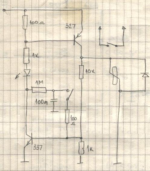 Kad prikljucis ovaj sklop na napon 12V, NE SME da svetli LED niti da privuce rele dok ne pritisnes taster. Ako se tebi to desava onda si ili nesto lose povezao ili je jedan od dva tranzistora neispravan.