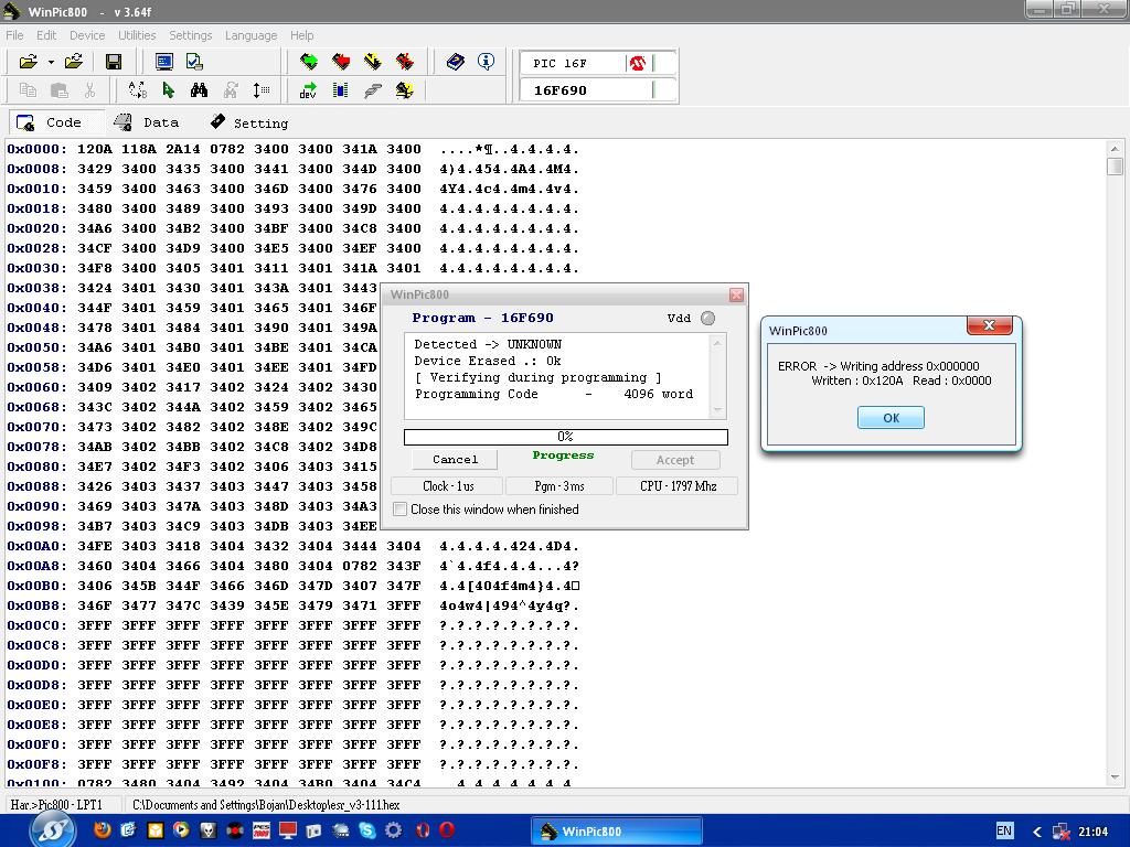 Evo na slici da ne bude da sam ga pogresno ubacio u podnozje, i sa izvadjenim jumperom JP1. Ne vredi, nece ni tako. Evo greska koju izbaci: