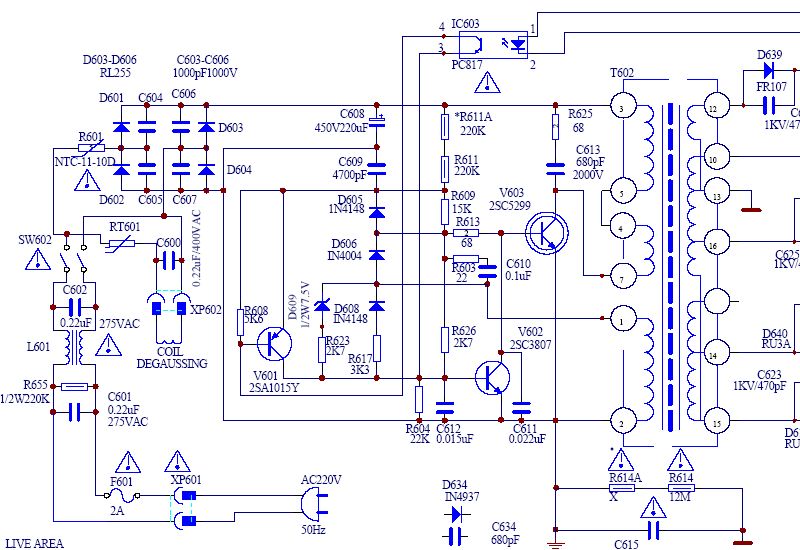 Ispitao sam napomenute otpore i oni su ispravni i ja od njih dobijam napon 19V koji ide na otpor R609 i na drugo kraju nema nista, a tr. A1015 sam i prije provjerijo i on pokazuje da je ispravan ali sam ga zamjenuo i stavio zamjenski BC557 i provjerio sam sve diode i otpore u mrezi pokazuju da su ispravni, a i ispitao sam diode na sekundaru i one su ispravne bas cudno TV opet neradi.