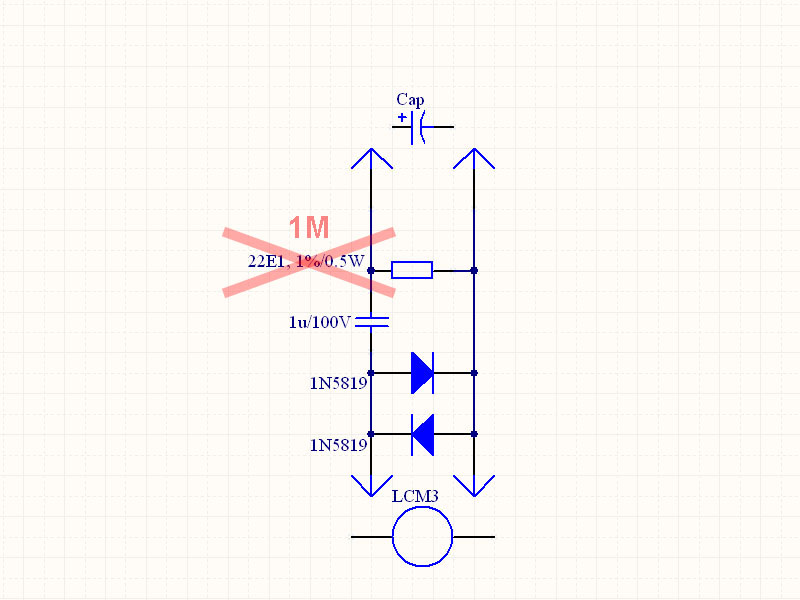 Ono što nisam primetio ranije je otpornik :!: od 22 oma :!: Ni u jednoj predviđenoj varijanti taj otpor ne može da preživi. Omov zakon jasno kaže da je za ovakav otpornik maksimalni napon na njegovim krajevima oko 5V (a ja sam pipalice testirao pod jednosmernim naponom od oko 160V). Koliko sam merenjem primetio, spalio sam ga, jer ommetar pokazuje beskonačnu otpornost. Ne znam zašto je stavljena tako mala vrednost. Staviću 1M, pa ću probati kako se ponaša. Molio bih Stoleta da vidi kako je kod njega izvedena zaštita.