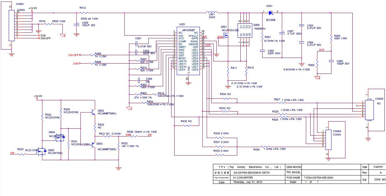 Jbg... ,nisi napisao da si rasturao displej.Te tri linije sa dioda što idu na čip,one idu na drein koji je u samom IC.Koliki je napon na elkou C807 (katoda D801)?Da bi IC proradilo treba da dobije "ON" sa digi ploče, takođe i regulacija svetla(R506 i R805) .Da li na tim otporima ima promene napona ?