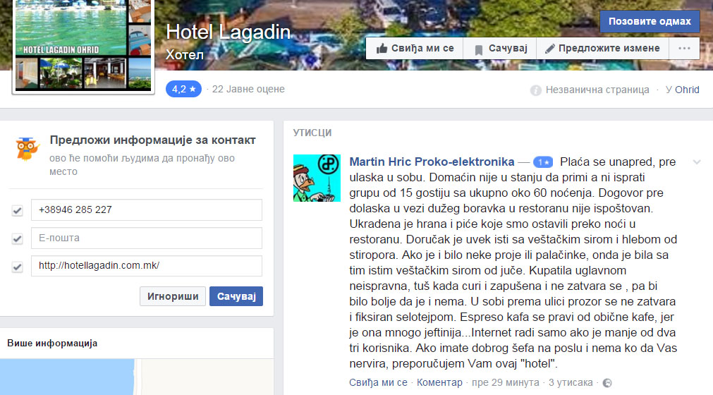 Postavio sam sledeći tekst na dva Facebook profila hotela Lagadin (nisu oni tamo neki sa samo jednim profilom...)