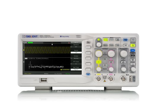The SDS1102CML+ is a dual-channel 100 MHz universal digital oscilloscope. It includes a 2 Mpts memory depth that helps to ensure accurate waveform resolution and to capture longer signal lengths. With its 7 inch TFT-LCD (800*480) screen, there is adequate screen space to help better see and analyze waveform details. Along with a 1 GSa/s sampling rate, the SDS1102CML+ supports 32 parameters measurements and common mathematical operations to speed up complex / repetitive measurements.