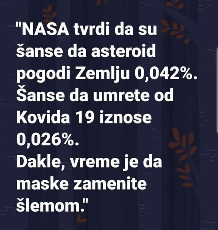 pa naravno da je morao to da objavi jer je njegov prijatelj iz vajne ''struke'' Dr. Miljko Ristić plašio JAVNO narod da su radili obdukcije, kako se organi raspadaju i sl...da bi uveličao dejstvo korone i poplašio narod. E sad je podignuta i optužnica protiv istog. Za to vreme mi nosimo maske od gaća, krpa sa sudove, miljea i sl. gušimo se ugljen diokdidom a kiseonik nam i ne treba? A najlepše od svega je što na svakoj kutiji od maski (ko ne veruje neka ode u apoteku i sam se uveri!!!!) piše DA NE ŠTITI OD KOVIDA-19 !! Naravno, da bi se ograničili od odgovornosti.