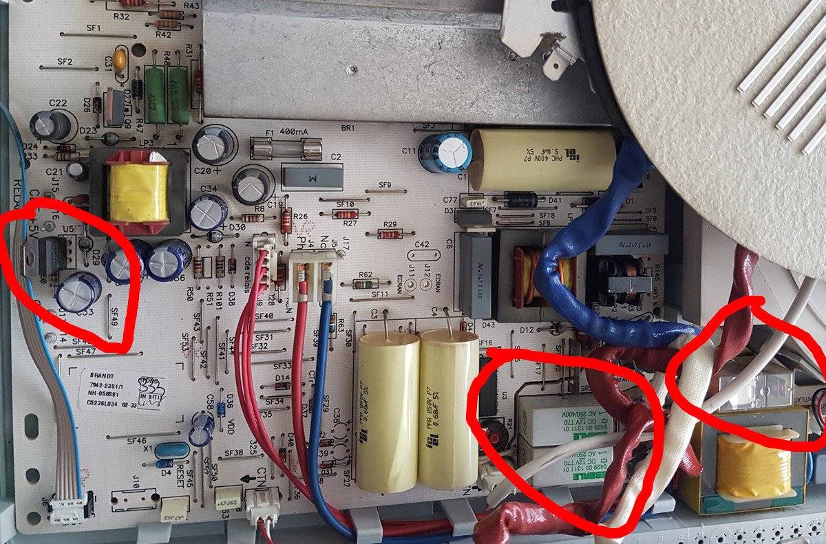 Zaokružio sam ono na šta ukazujem na slici.Pretpostavka da je stabilizator 7805 u pitanju,na njemu možeš da meriš napon,obično je na ulazu oko 14V,na izlazu 5V,prv pin ulaz,drugi pin i hladnjak masa,treći pin +5V.Sa tim ćeš ispitati napajanje elektronike dve desne ringle.Ako sam promašio meri na elektrolitima.Takođe releje zameni bez merenja/ili zameni levu sa desnom stranom,tj ukrsti sigurno ispravne sa sumljivima.