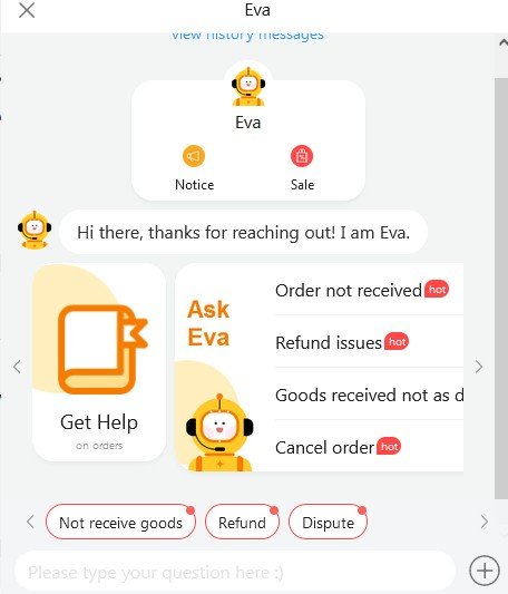 Ja sam ovde postavio pitanje i žalbu na prodavca kao na slici. Eva jeste robot ali pitanje se šalje živom Kinezu koji posle šalje odgovor. Meni su tako vratili novac a imao sam identičnu situaciju kao @goranfri.