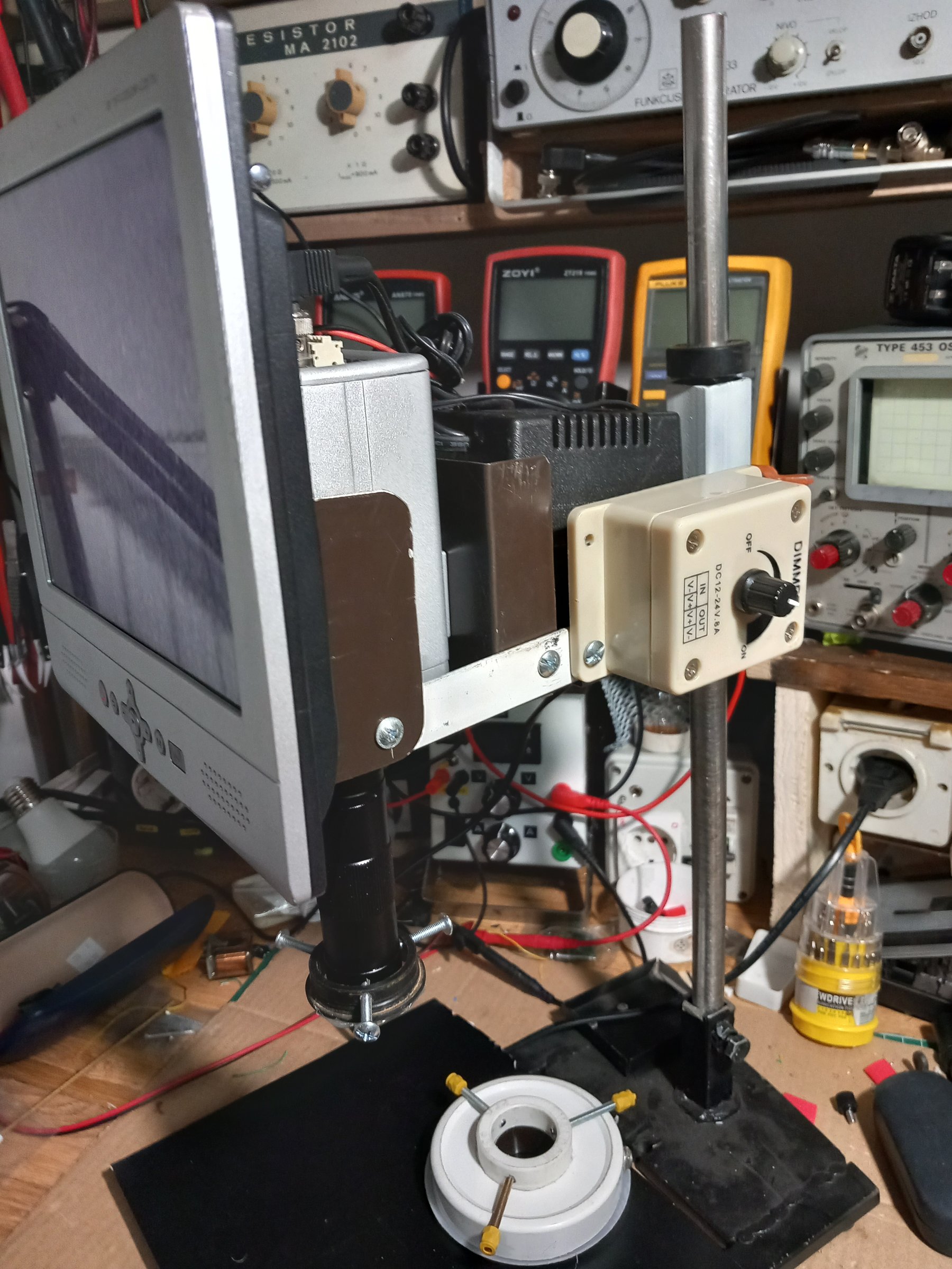 Nedavno mi je sa aliekspresa stigao digitalni mikroskop Yizhan od 13MP koji me je uz porez izašao nepunih 100 evra (kinezi napisali vrednost 15 evra pa sam poštaru dao 500 dinara).Sočivo na mikroskopu je uvećanja 150X, opseg rada od 5cm do 100cm. Uz kameru je stigao stono mikrofonsko postolje koje sam iskoristio za lupu, a kamera je postavljena na postolje koje već imam za montažu po potrebi klasičnog stereo mikroskopa s tim da sam sada dodao 17 inčni monitor jer kamera ima VGA i HDMI izlaz jer mi to odgovara a uklapa se u cenu do 100 evra koju sam odredio za nabavku.Monitor je sada stalna postavka jer ne smeta ni klasičnom mikroskopu.Namena mu je prvenstveno inspekcijska jer zbog kašnjenja digitalnog signala nije baš pogodan kod lemljenja-Na slici je radna distanca 30cm.