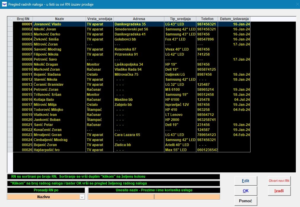 Radi lakšeg pronalaženja nekog radnog naloga, na staranici Menu, nalaze se i dva slična tastera, slična po funkciji, a to su tasteri Pronadji RN i Radni nalozi – izdati. U obrascu Pronadji RN nalazi se spisak svih aparata, popravljenih i nepopravljenih iz svih godina, dok se u obrascu Izdati, nalaze samo izdati aparati. Ovo razdvajanje je uradjeno iz sledeceg razloga. Nakon godinu, dvije, baza sa aparatima dosta naraste i u servisu ima veliki broj neizdatih uredjaja po bilo kom osnovu, čeka se nabavka dijela ili stranka ne preuzima aparat. Da bi se službenik lakse snašao, ako staranka kaze da je aparat jos u servisu, on ce isti tražiti u Pronadji RN, a ako je aparat već izdat a stranka prijavljuje npr. reklamaciju, sluzbenik se podatke o ovom aparatu prije naci u listi Izdati. Na slici ispod je izgled obrasca Izdati
