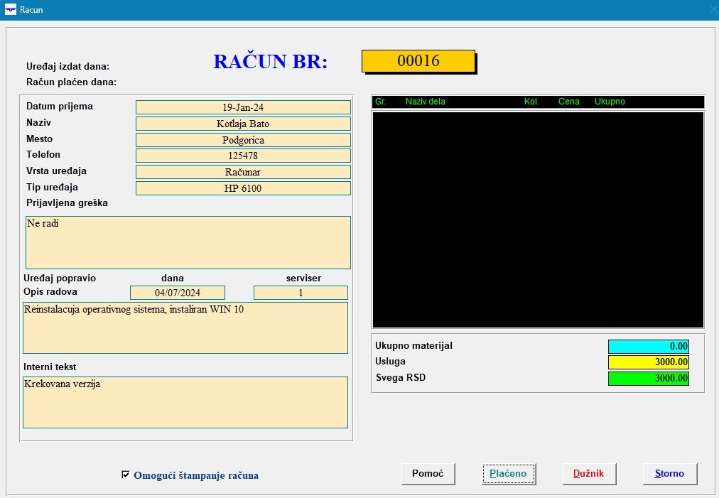 Prilikom prijema aparata na popravku kao i prilikom izdavanja, štampaju se radni nalog ili račun sa svim neophodnim podacima.