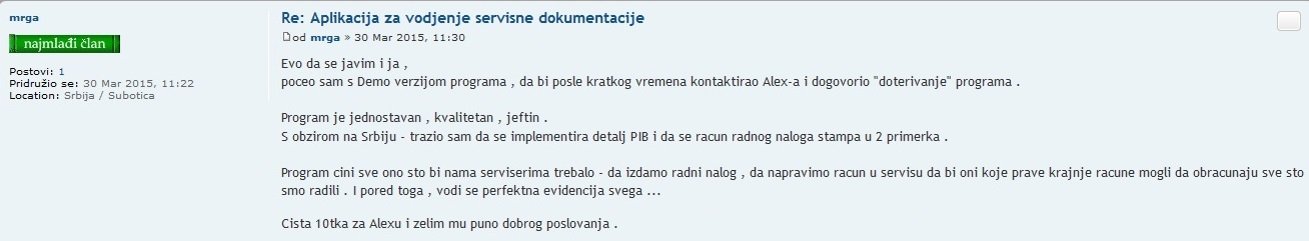 Koristim ovu aplikaciju oko pola godine svaki dan i mogu da kažem da je fenomenalna. Jednostavna je, radi na svaki Windows koji sam probao i baš je dobro pregledna. Štampa servisni nalog automatski posle popunjavanja što mi se baš sviđa i svaki servisni nalog čuva kao PDF fajl. Svakom servisu preporučujem ovu aplikaciju.