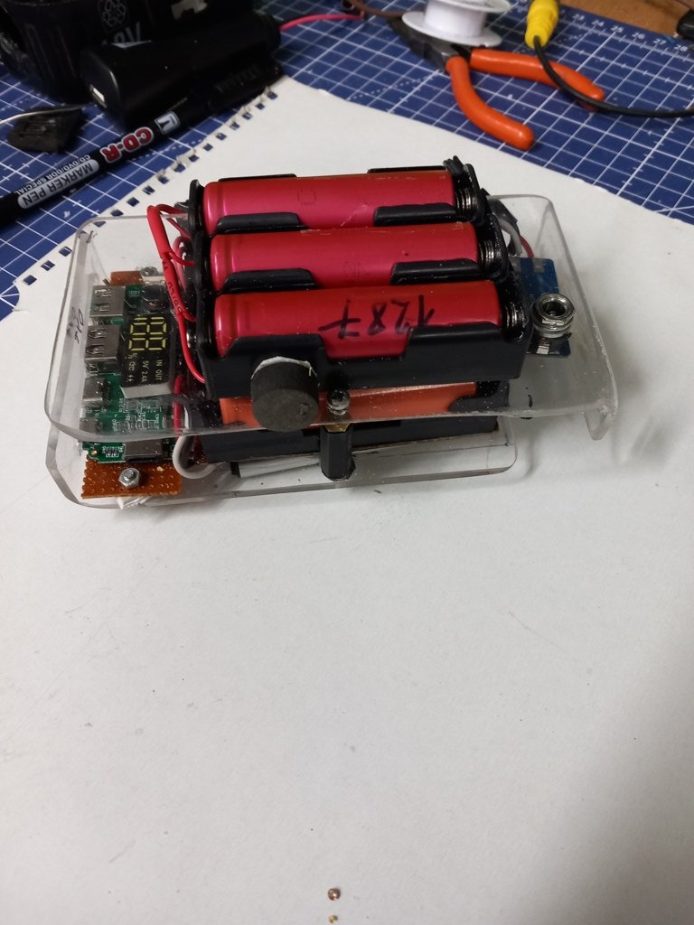 Baterija od mobilnog se puni preko Power bank modula dok se ostale vade i pune se na punjaču za tri baterije.Sve baterije su povezane paralelno tako da daju oko 15A.