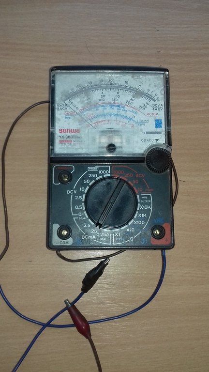 Analogni unimer prepravljen za popravak daljinskih.Unutra su dve baterije od 1,5V spojene na red sa jednim od izvoda,recimo COM-.Na kraju žica su krokodilke.99% daljinskih su sa dve baterije,sa ovim unimerom em imamo napajanje daljinskog pri popravci,em je lako meriti struju koju povlači.Najbitnije je izmeriti miliampere u stanju mirovanja,obično neispravan daljinski ima nekoliko miliampera u mirovanju,a ispravan nula,itd.