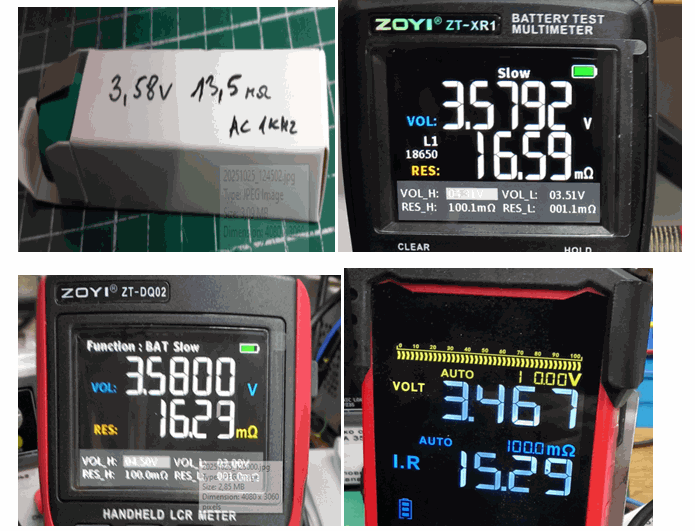 Aleksa je već odgovorio.Kako su baterije kondenzatori ili obrnuto meri se unutrašnji otpor koji govori o stanju baterije (kod kondenzatora ESR).Instrument sa ueo jer je precizan kao multimetar a ujedno i kao miliommetar-Na liion bateriji koja mi služi kao etalon koju sam uz još nešto naručio od firme iz Rume koji su izvršili merenje na svojoj opremi dobijeni su sledeći rezultati na još dva instrumenta.