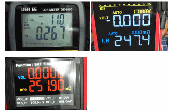 Aleksa je već odgovorio.Kako su baterije kondenzatori ili obrnuto meri se unutrašnji otpor koji govori o stanju baterije (kod kondenzatora ESR).Instrument sa ueo jer je precizan kao multimetar a ujedno i kao miliommetar-Na liion bateriji koja mi služi kao etalon koju sam uz još nešto naručio od firme iz Rume koji su izvršili merenje na svojoj opremi dobijeni su sledeći rezultati na još dva instrumenta.