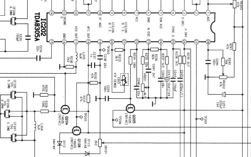 Napajanje na Colector na Q205 je 12V, kada ne traze kanali napon na baze od Q205 je 1.5V a kada traze t.e. kada naide na kanal napon se menjue izmegju 5V i 8V zavisni od jacinu kanala.A na pin 34 od PCA napon je od 0.5V kada ne traze i do 5V kada naide na kanal.