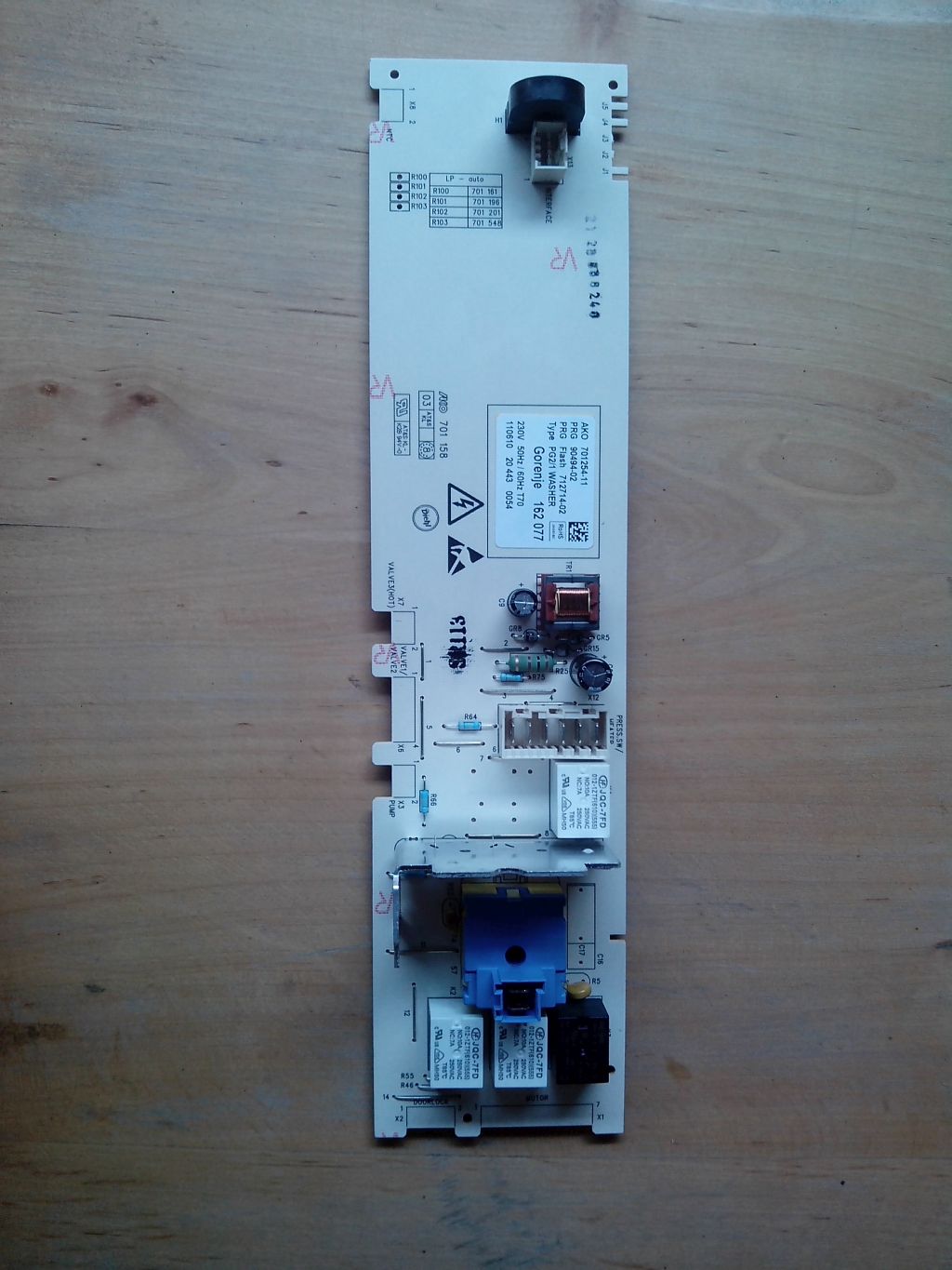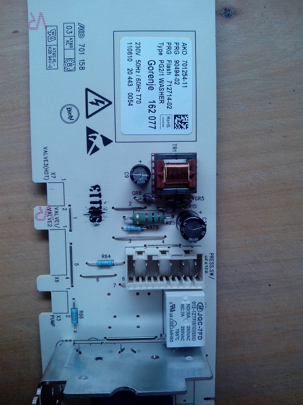Veš mašina Gorenje WA 6211, tip;ps23/110, stradala upravljačka ploča zbog udara groma.. oznake PG2/1 Wacher. V062, proc.NEC 78F9177A, eeprom-24C02. pošto je ploča nepopravljiva vlasnik je odneo staru ploču u servis_prodavnica Gorenje, i na osnovu stare ploče prodali mu novu koja zamenjuje postojeću staru nosi oznaku PG2/1 Wascher,AKO 701 254 11 flach 712714-02, proc.NEC F0123H, i atmelov IC Fleš 25040.