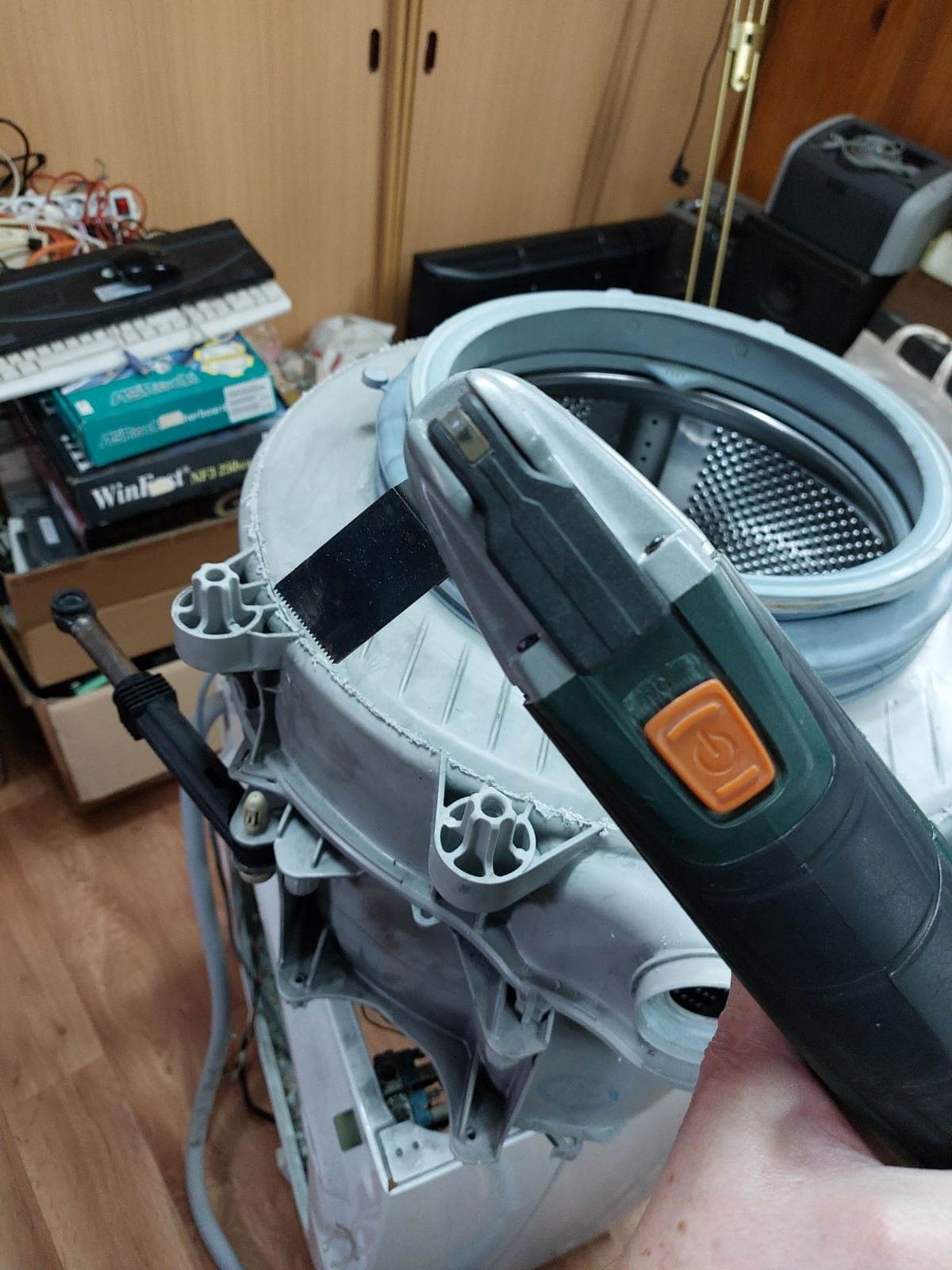 Ne bavim se profesionalno popravkama veš mašina. Na mojoj Beko veš mašini su otišli ležajevi. Mašina ima 12 godina. Nije procurila, ali pri okretanju levo desno se čuje da struže, a tek pri centrifugiranju je bila katastrofa od buke. Do sad sam menjao grejač vode i četkice na elektro motoru.Za sve ove godine, odlično, pošto se kod nas u kući koristila neverovatno mnogo. Prosek bi bio jedno pranje svakog dana u godini (bukvalno bez preterivanja). Najviše zahvaljujući informacijama sa ovog mesta ( i YouTubu :) ), uspešno sam izvršio sečenje kazana (čeonom vibracionom testerom - Renovator), zamenu (ležajeva i semeringa - ukupno 900 din + 450 din za specijalnu mast za semeringe) i naravno ponovno zavarivanje. Odlučio sam se za čeono sečenje kazana, zbog toga što tu nema nkakvih nosača, pa računam i sile naprezanja su tu najmanje. Tako da zavareni spoj bude što manje opterećen kasnije u radu. Mesingani prsten na osovini je bio loš. Probao sam da ga ispoliram ali i dalje nije bio dobar. Odneo dam ceo bubanj kod strugara i on mi je zamenio tu mesinganu čauru (1000 din). Napominjem da je to izuzetno bitno, inače ni novi semering neće dugo raditi posao- procuriće. Za zavarivanje sam koristio duvaljku Baku, koju imam godinama i služi mi za zamenu smd elemenata kod poptavki elektroskih ploča. PP elektrode kupio u Aldos Kragujevac (1200 din 0,25kg, a potrošio sam 4 elektrode od oko 45 komada koliko ih ima u 0,25kg (ne prodaju na manje)). Nisam do sad radio varenje plastike, ali vam mogu reći da to ide sasvim lepo. Bitno je samo da se sve lepo ugreje i polipropilen postane testast. Elektrodom vršim pritisak na mesto zavarivanja, pod uglom od 90 stepeni u startu, a kad počne sjedinjavanje materijala, držim je napetu, polusavijenu u suprotnom smeru od smera zavarivanja i utapam je. Grejem, zajedno elektrodu i kazan, pa se materijali spoje.Treba malo prakse, ali rekoh nije problem. Imate toga da nađete na youtubu. Ukupno sam potrošio 3550 din za delove i mašina opet radi kao nova
