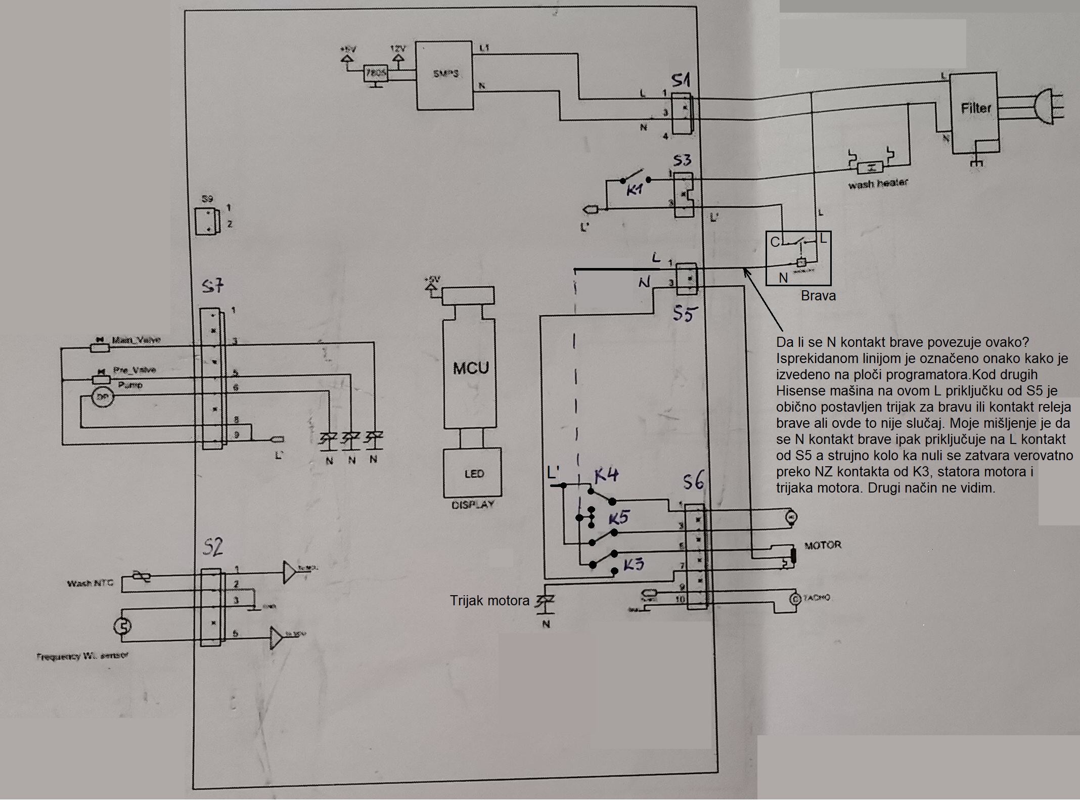 Ne mogu da provalim na koji konektor i kako se povezuje brava vrata ove mašine. Nije klasika kao kod ostalih mašina. Nema trijak za tu namenu i rele. Međutim, Postoji jedan rele K3 koji je povezan sa dvopolnim konektorom S5 (priključci označeni sa L i N) za koji ne znam namenu i koji mi je jedini ostao nedefinisan. Ovaj K3 rele se koristi i kod motora sa 5 izvoda koliko sam uspeo da provalim.