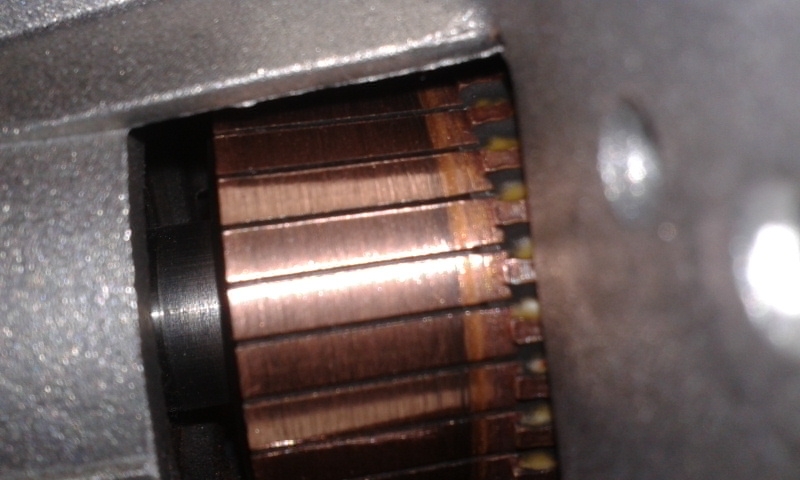 Kolektor rotora jeste bio crn od grafita sa četkica ali nije bio nagoreo od varničenja i nije imao neravnina po obimu, ja sam ga posle probe očistio i proseko veze među lamelama preventive radi - nije bilo neophodno.