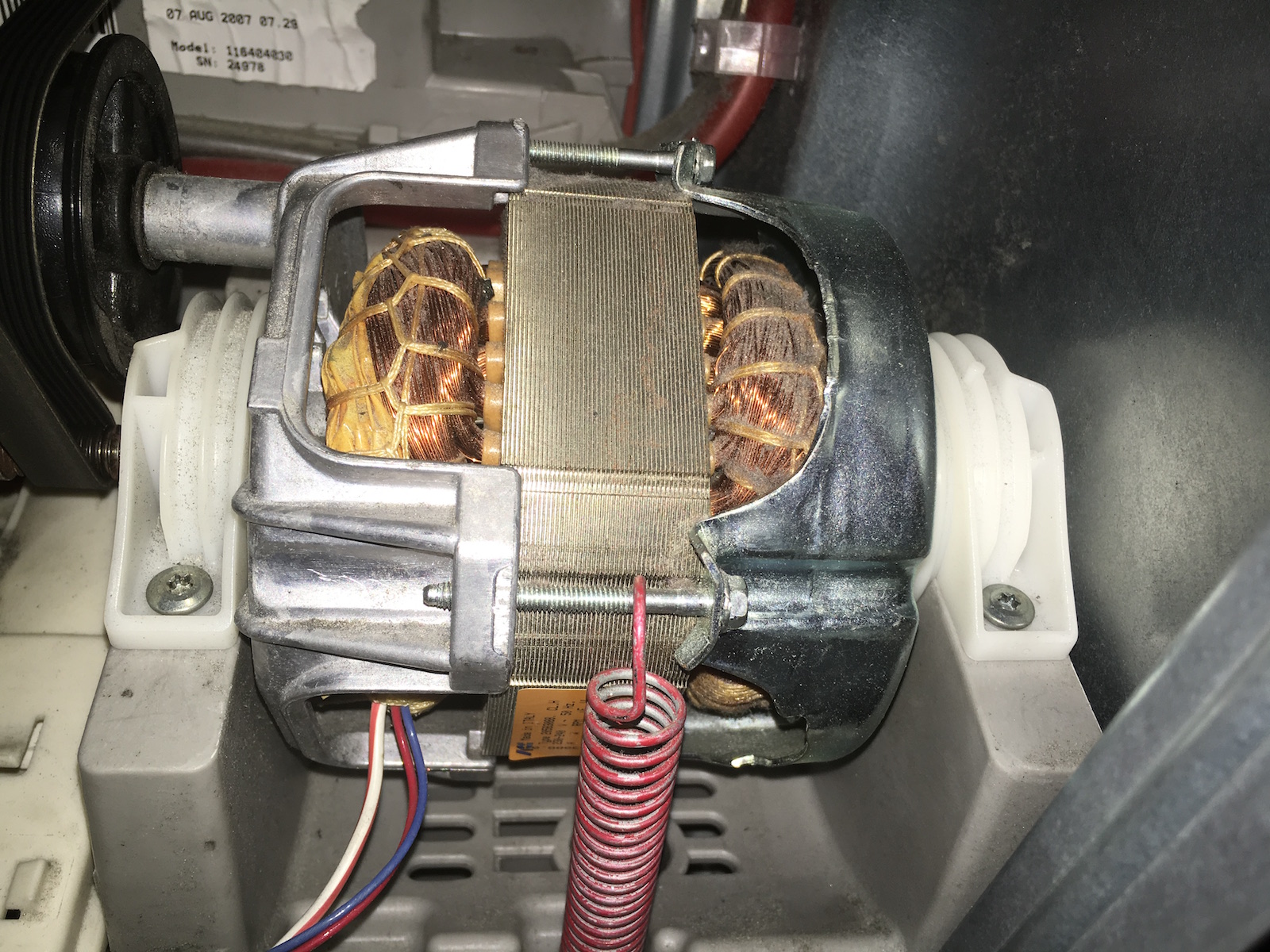 Probaj meriti napon na konektoru sa ploče. Kada uključiš motor direktno probaj opteretiti remenicu pa vidi.Ako je motor u redu i kondenzator onda je problem na elektronici , napajanje motora nije dobro..