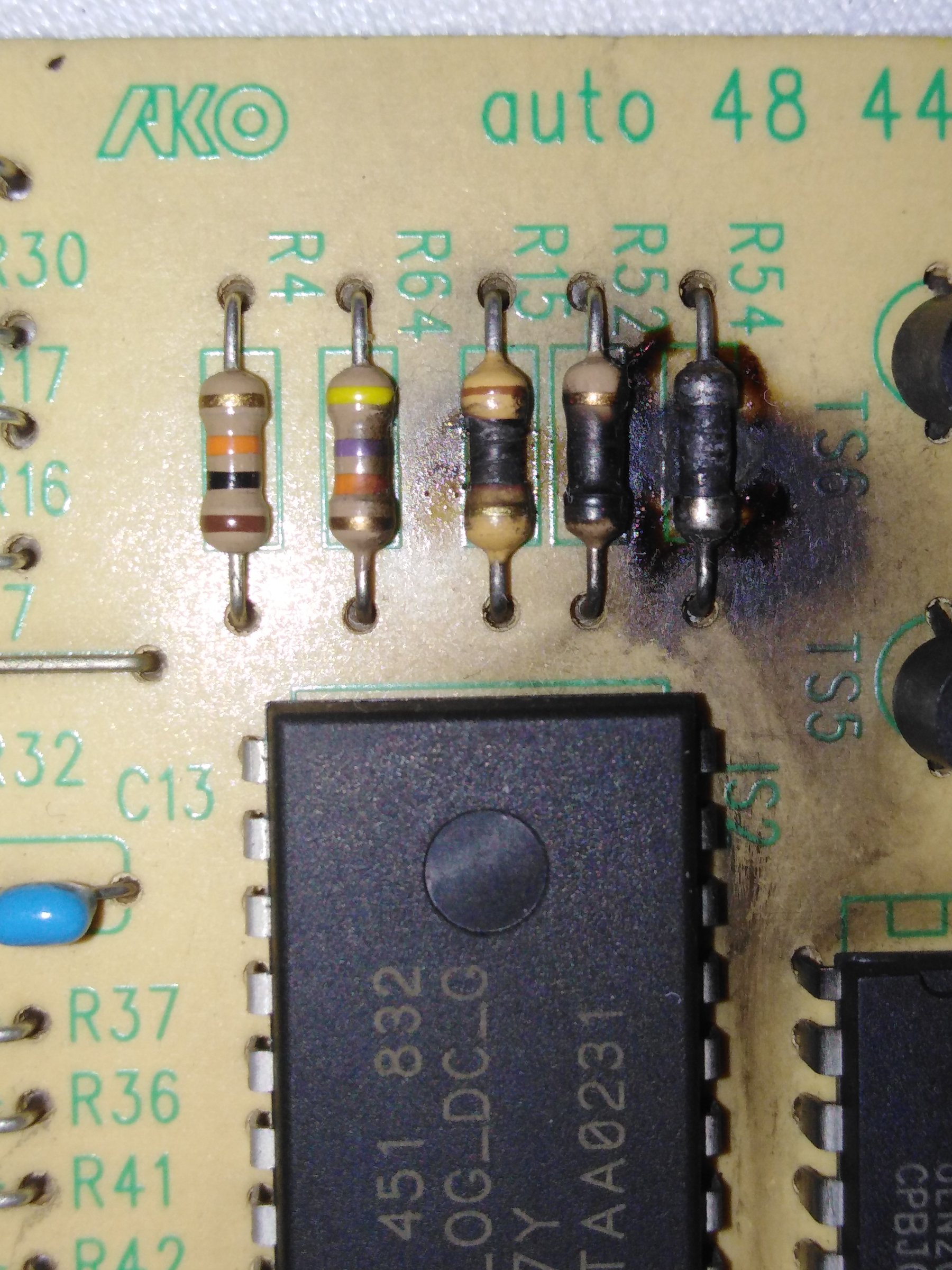 Pojedini elementi na pločici su pregorjeli. Mislim da je to se od switcher chipa,koji je također u neprepoznatljivom stanju.