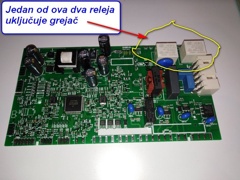 Dalje razmišljanje je samo kako bih ja pokušao.Jedan od dva releja uključuje grejač.Lako se po shemi ili ožičenju vidi koji.Merio bih napon uklapanja releja,ili verovatnije postavio LED diode/sijalice da mi signaliziraju uključenje releja.Ako se relej uključi,a ne greje vodu,greška ili sam relej loš,ožičenje,presostat,grejač,ako se relej ne uključi onda NTC,elektronika.