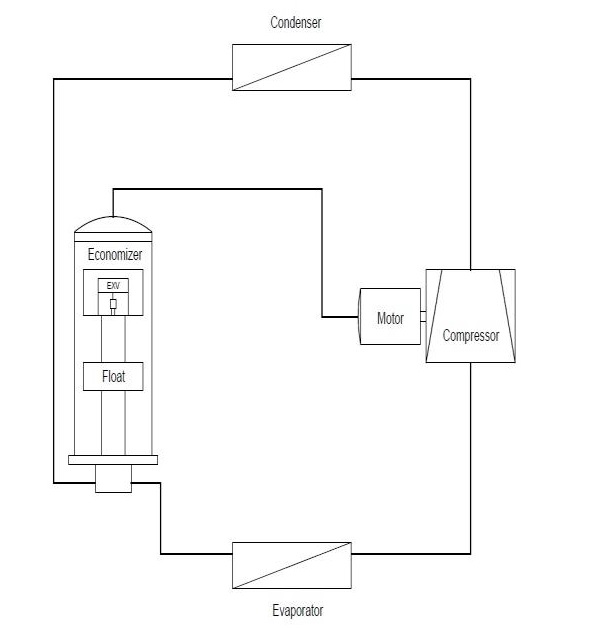 Evo ti slike tvog tipa ekonomajzera, dve principijalne, treca je dijagram termodinamickog ciklusa. U sustini razdvaja tecnu i gasovitu stranu rashladnog sredstva.Dize granice radnog pritiska kompresora, bez da se radi na njegovoj robusnosti. U vecini slucajeva se radi o vijcanim kompresorima ali moze i u centrifugalnim.