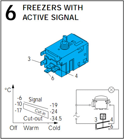 na svakom termostatu ti pise broj kontakta i za koju je struju kontakt 5 ili 6A to su kontakti za ukljucenje kompresora a o,2 ili 0,4 ti je signal ili pak za treci kontakt signala tj. alarma...i alarm je u opsegu -4 do -14 stepCelzija.