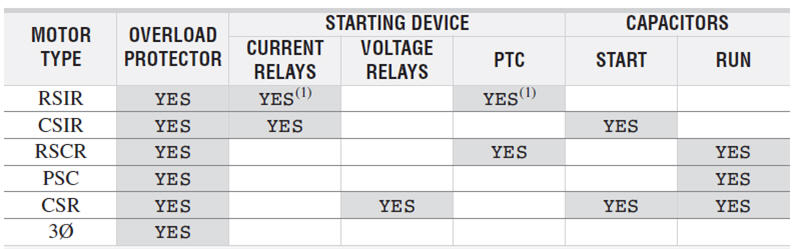Ovaj kompresor može biti RSIR (niski okretni moment) i CSIR (visoki okretni moment) ovisno o startnom kompletu.