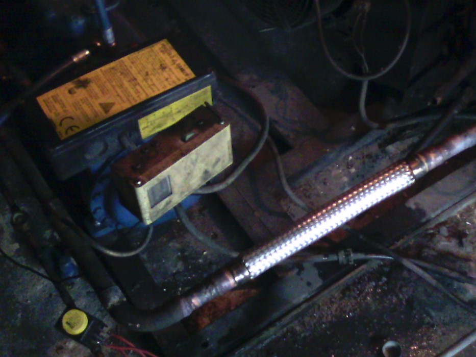 Na slici se vidi samo da sam zalemio absorber vibracija na mestu starog absorbera, u objasnjenju pise da sam vamumirao sistem i da u ponedeljak nastavljam sa poslom. NIti se vidi gde te cevi idu, dali dole u zemlju, dali gore u vazduh, dali pravo napred, niti se vidi izolacija koju sam skinuo zbog lemljenja, niti se vidi da je strana visokog pritiska presostata vezana za servisni ventil visokog pritiska, tako da ne moze da se koristi, ni da je u pozadini odvajac ulja koji nije u funkciji.