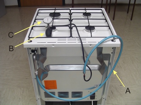 gumenu cijev (A) manometra namjestiti na PB priključak aparata. Ako aparat nema priključak PB (D), koristiti