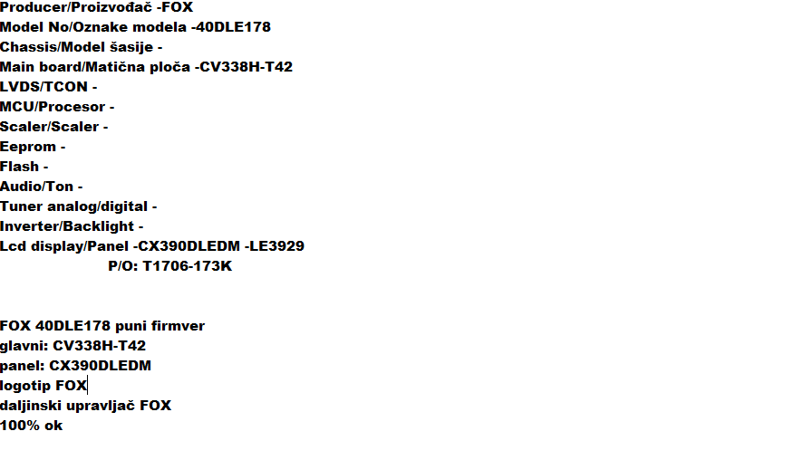 Praviš bespotrebno zbrku na forumu. Tema u kojoj pišeš je za aparat Fox 40" sa pločom CV338H-T42 i panelom CX390DLEDM a ti uskačeš u tu temu i tražiš za svoj 43" bez podataka o ploči i panelu.