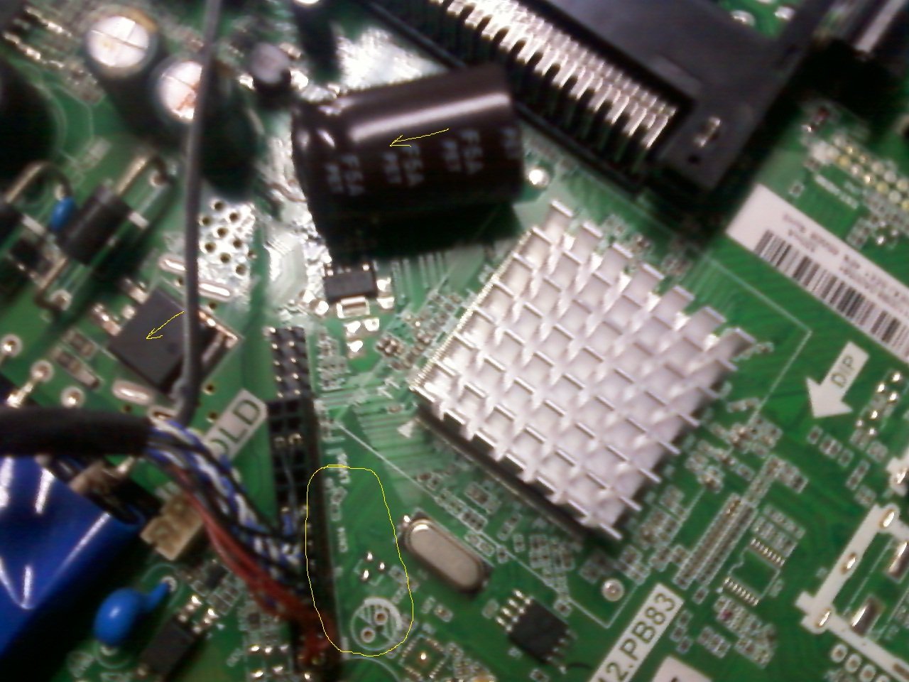 Uklonio sam crveni lepak sa main board ploce kojim je konektor bio zalepljen.Pokrivao je celu povrsinu uokvirenu zutom bojom.Nije bilo mnogo komponenata ispod lepka,ali ima praznih mesta ciji su lemni padovi jako oksidirali izgleda od lepka.Takodje sam skinuo sloj i sa plasticnog dela konektora jer je prespajao + i - zice za napajanje T-con.
