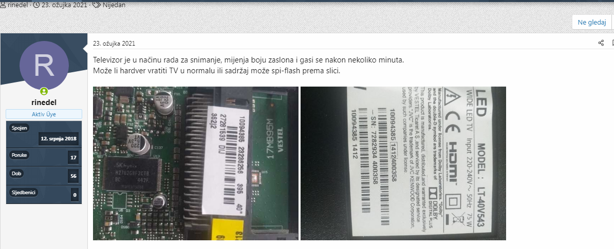 izgleda da nije menjana...sad gledah po netu...izgleda koliko danas da je na kupujem prodajem prodata jedna takva ploča, obrisan je oglas ali je u slikama ostala i izgleda je ista...šta mu je sad? SW ti je orig, kao i što vidiš...ne bi trebalo to da se dešava, ti apdejti prolaze lagano. Držiš Ok na daljincu i TV ubodeš u struju, krene boot i čekaš dok ne završi. Osim, ako nije crkao fleš ? Jesi probao da ga zameniš, mislim na 1605..