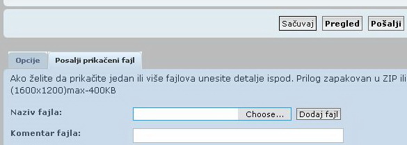Prvo ga spakuješ (WinRar, WinZip), zatim na Posalji prikačeni fajl, Choose... i kad odabereš fajl, Pošalji.