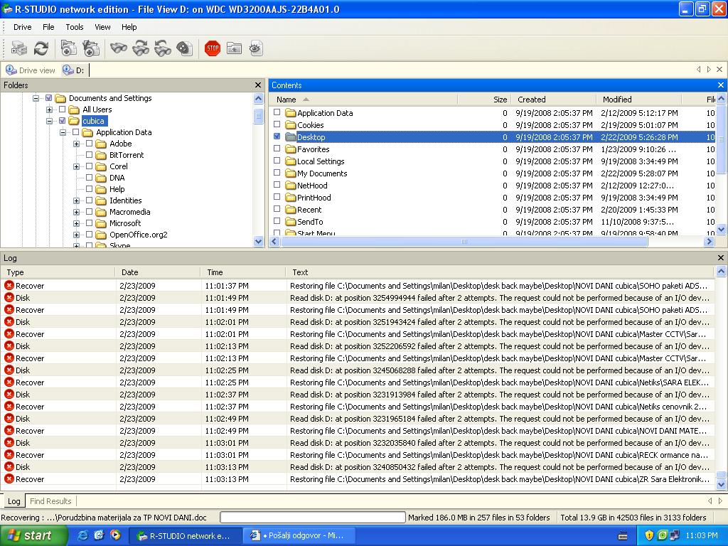 R-studio, GetDataBack, DiskDoctor...svi se slicno ponasaju, sad je na njemu R-studio i posle silnih gresaka u citanju radim recovery samo fajlova sa desktopa (cisto za probu)...non-stop ima I/O gresku u citanju i za sada na desktopu dobijam samo cistu rutu sa folderima ali bez fajlova (0 bytes) cak ih i nema, samo prazni folderi...