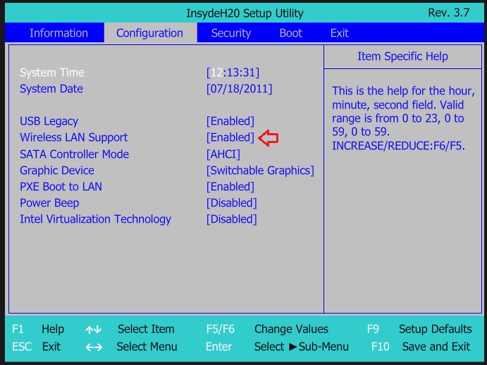 Uključivanje/isključivanje wireless-a ide preko kombinacije Fn+F7 ili samo F7, zavisi od toga kako je u BIOS-u podešeno da se ponašaju funkcijski tasteri.