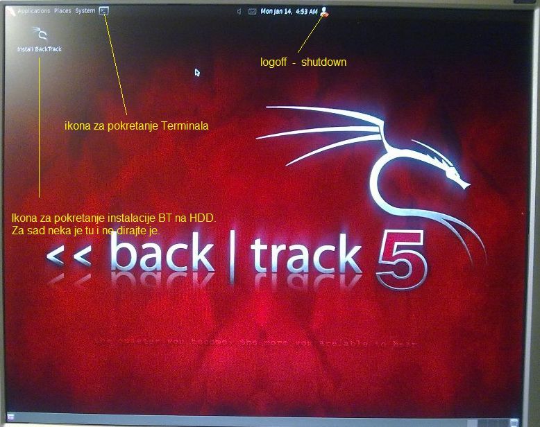 Na slici sam obeležio ikonu za pokretanje terminala jer će nam biti potrebna i ikonu gdje gasite racunar.