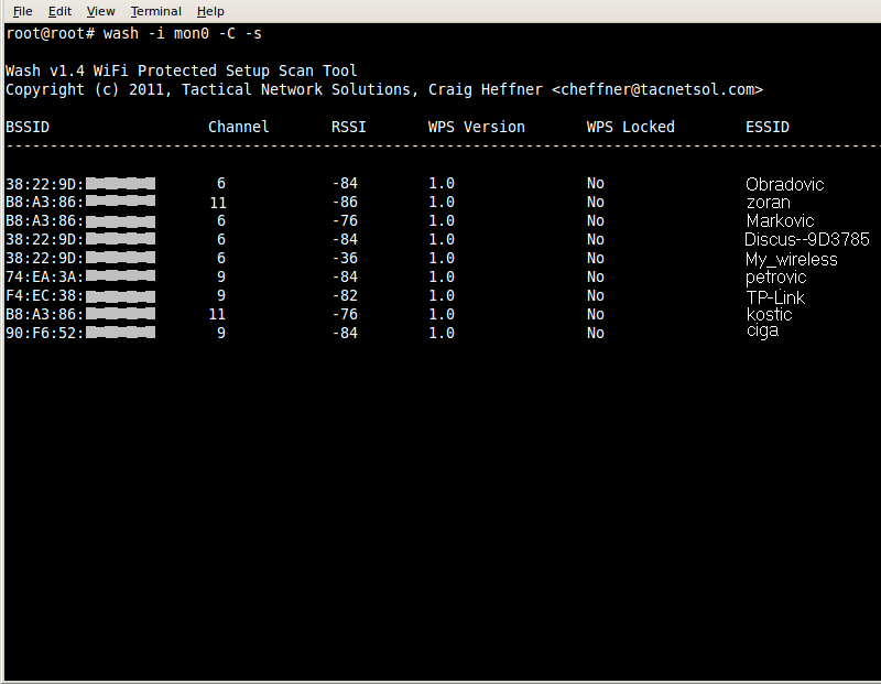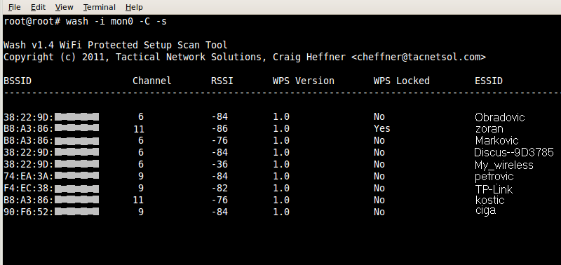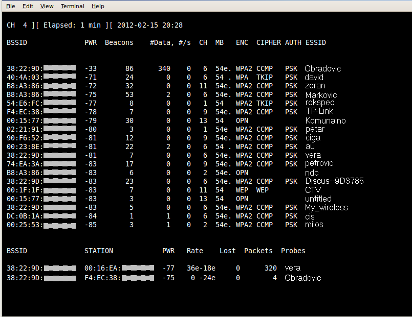 Ako u okruženju ima više mreža, biće prikazane sve. Potrebno je sada izabrati mrežu za napad. Prvo ćemo zaustaviti karticu da ne skenira frekvencije. To ćemo uraditi istovremenim pritiskom na testere ctrl i c (