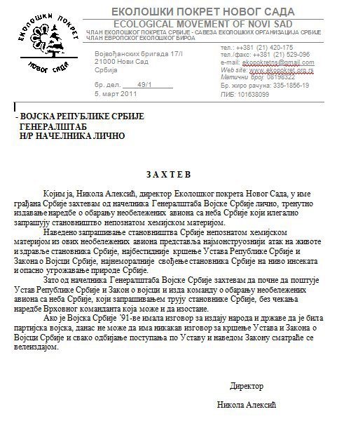 Nikola Aleksic, zahtev Generalstabu vezan za chem trails.
