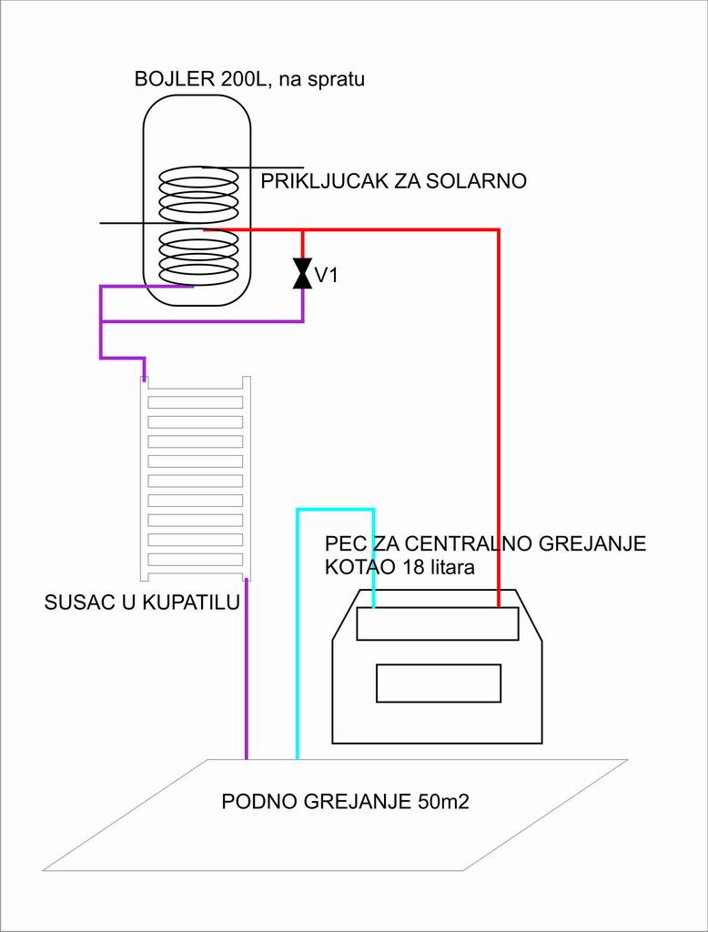 http://www.etazgrejanje.com/katalog.php?prodID=23&catID=1172&lng=srbzamisao je da se zagrejana topla voda iz pecke (temperatura izduvnih plinova 170-200C po mojim saznanjima) prvo vodi u bojler od 200lit ( sa dva izmenjivaca) za sanitarnu toplu vodu na spratu i tu preko izmenjivaca zagreva do na pr. 50C. Taj isti bojler ce biti prikljucen i na solarne toplotne panele ali o tome drugom prilikom...Iz bojlera, ohladjena voda se spusta do susacha u kupatilu: