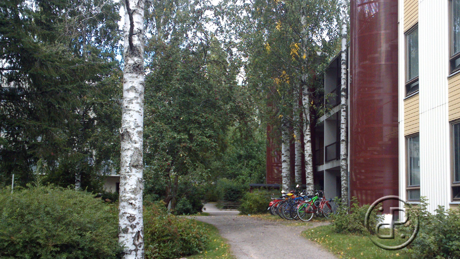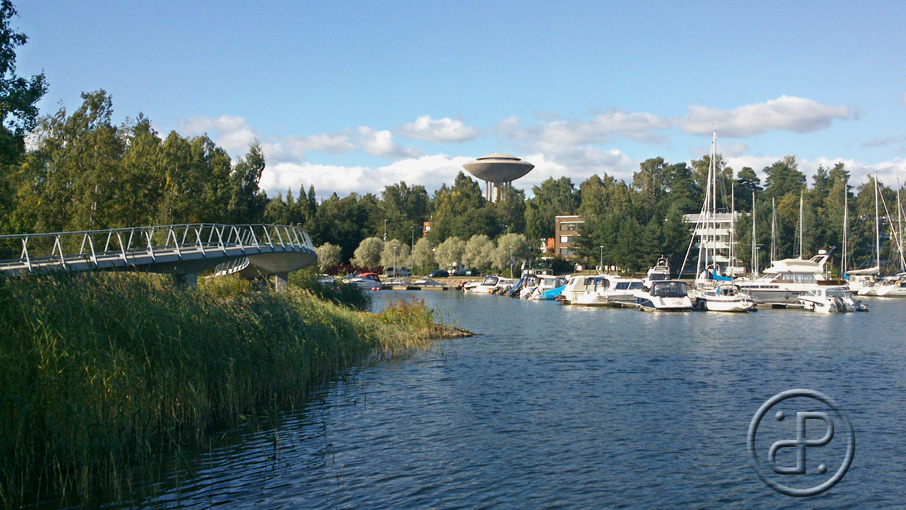 Espoo, naselje pored Helsinkija, kao Novi Beograd, samo je odnos drveća i zgrada obrnut.Drveće je uklonjeno samo gde su temelji kuće, ali zato ga sade okolo, iako ga ima dovoljno.Pešački most na jedno od mnogobrojnih ostrva.Ovakvih punktova u Helsinkiju ima oko 150, bicikl se uzme i ostavi na bilo kojem drugom takvom punktu.