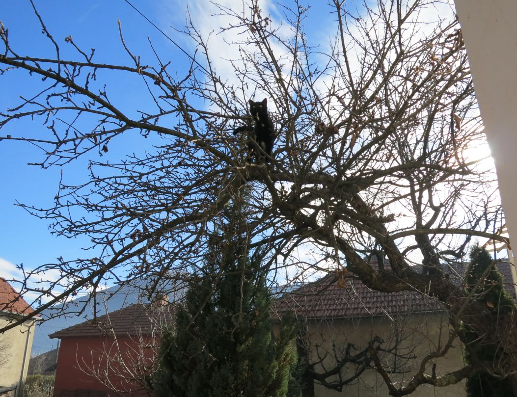 Ma kakvi, ovo je sad luđe nego ranije. Uhvatila je neko šareno pilence danas i jednog vrapca. Kasnije sam video još jednog vrapca, možda je od danas, možda i od juče, prekjuče, nije se video od snega. Pobiće sve ptičice.